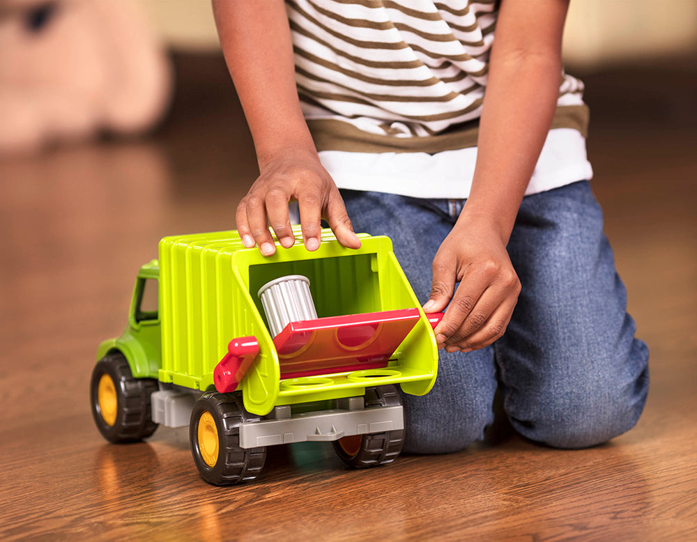 Includes: 1 garbage truck, 1 driver and 2 toy recycling bins.