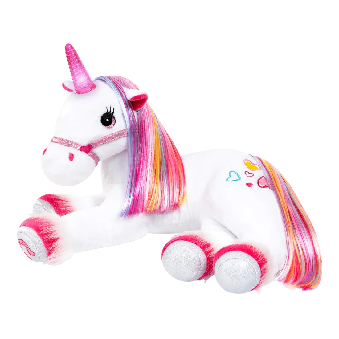 Cette magnifique licorne en peluche inspirera l'imagination des enfants ! Avec sa belle et longue crinière colorée, ses grands yeux et ses cœurs cousus, cette peluche deviendra vite un compagnon adoré des enfants à la maison, avec les copains ou en sortie. Dès que l'on touche ses plaques ou son sabot, sa corne s'illumine comme par magie et il émet des sons. Le voyage vers un merveilleux pays des rêves avec de nombreuses idées de jeux de rôle peut alors commencer. Grâce à son corps doux, ce jouet est en outre parfait pour les câlins ! La licorne en peluche est livrée dans une belle boîte de présentation.