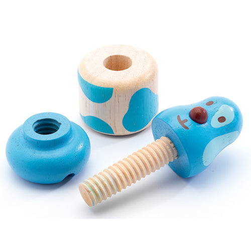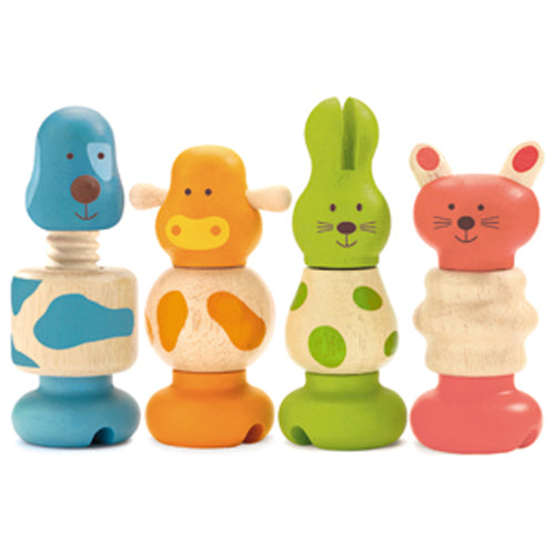 4 wooden animals to screw and unscrew to develop toddlers' dexterity.