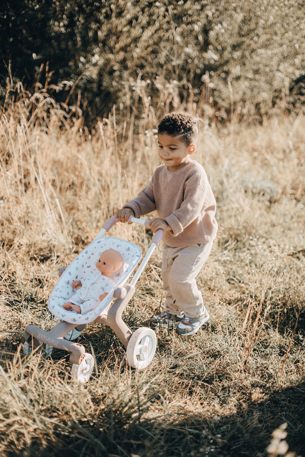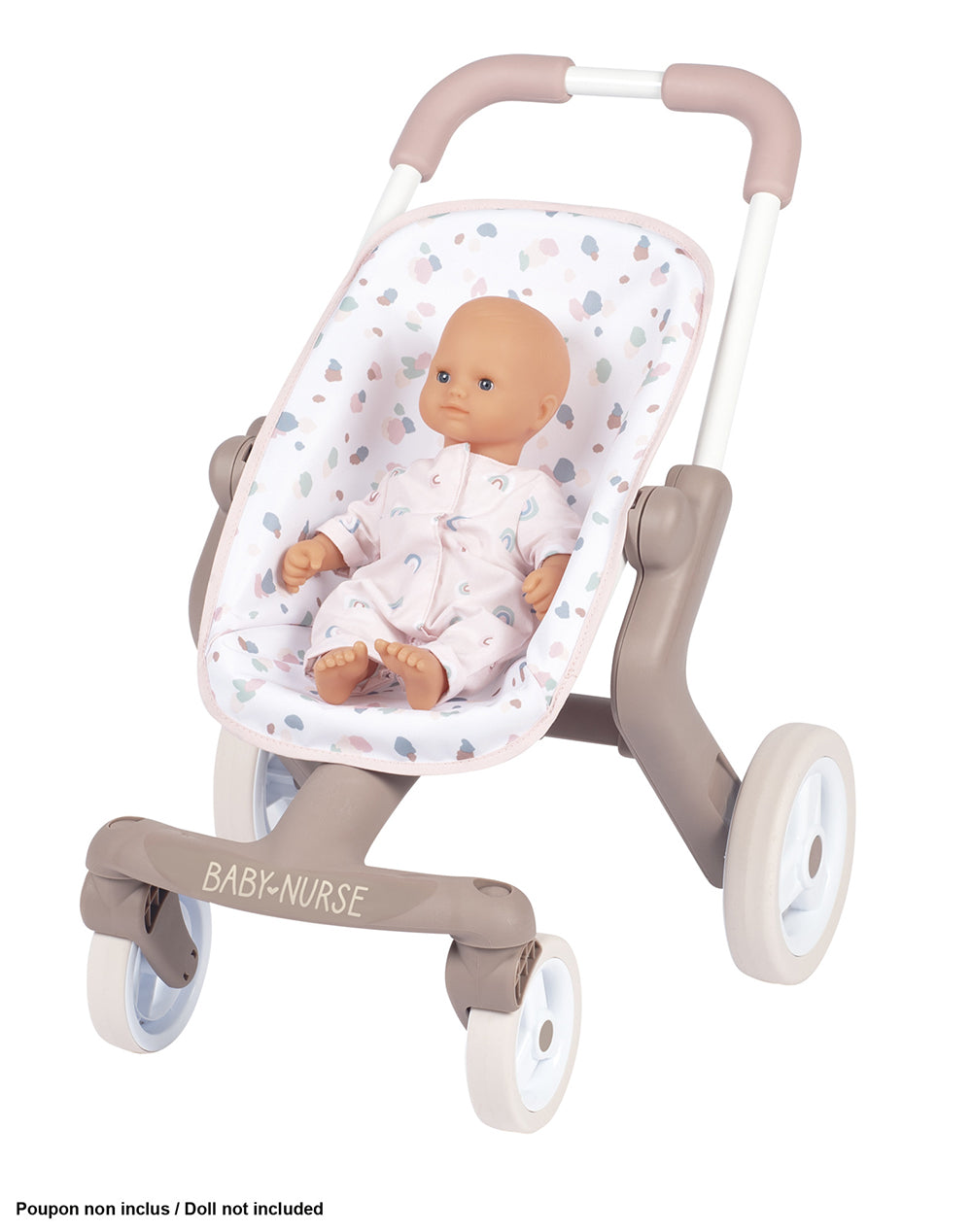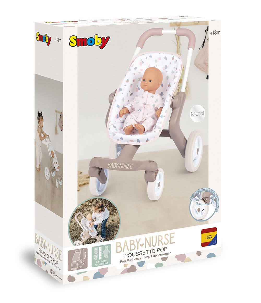 Baby Nurse 4-wheel stroller for babies up to 42cm. It features metal tubes and a fabric seat. Its handle is ergonomic and easy to grip. Its steerable and multi-directional front wheels make this stroller light and easy to maneuver.