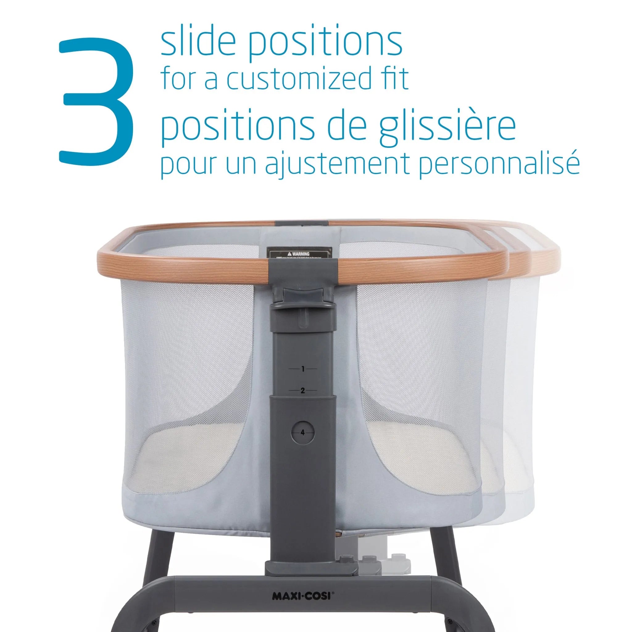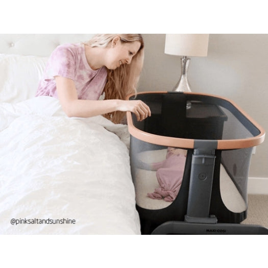 Versatility is also important. This is thanks to the Iora bassinet's four different height positions, which give you a personalized fit. The Iora bassinet can be adjusted not only from top to bottom, but also from side to side. For those moments in the middle of the night when your baby wakes up crying, you can easily slide the bedside bassinet closer to the bed to provide comfort and attention.