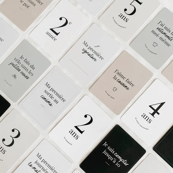 The box includes 25 pretty little unique cards to help you immortalize the first moments and great moments of early childhood of your precious ones.​ Also have fun writing down the more specific details of your child's development on the back of each of the boxes to then keep them.