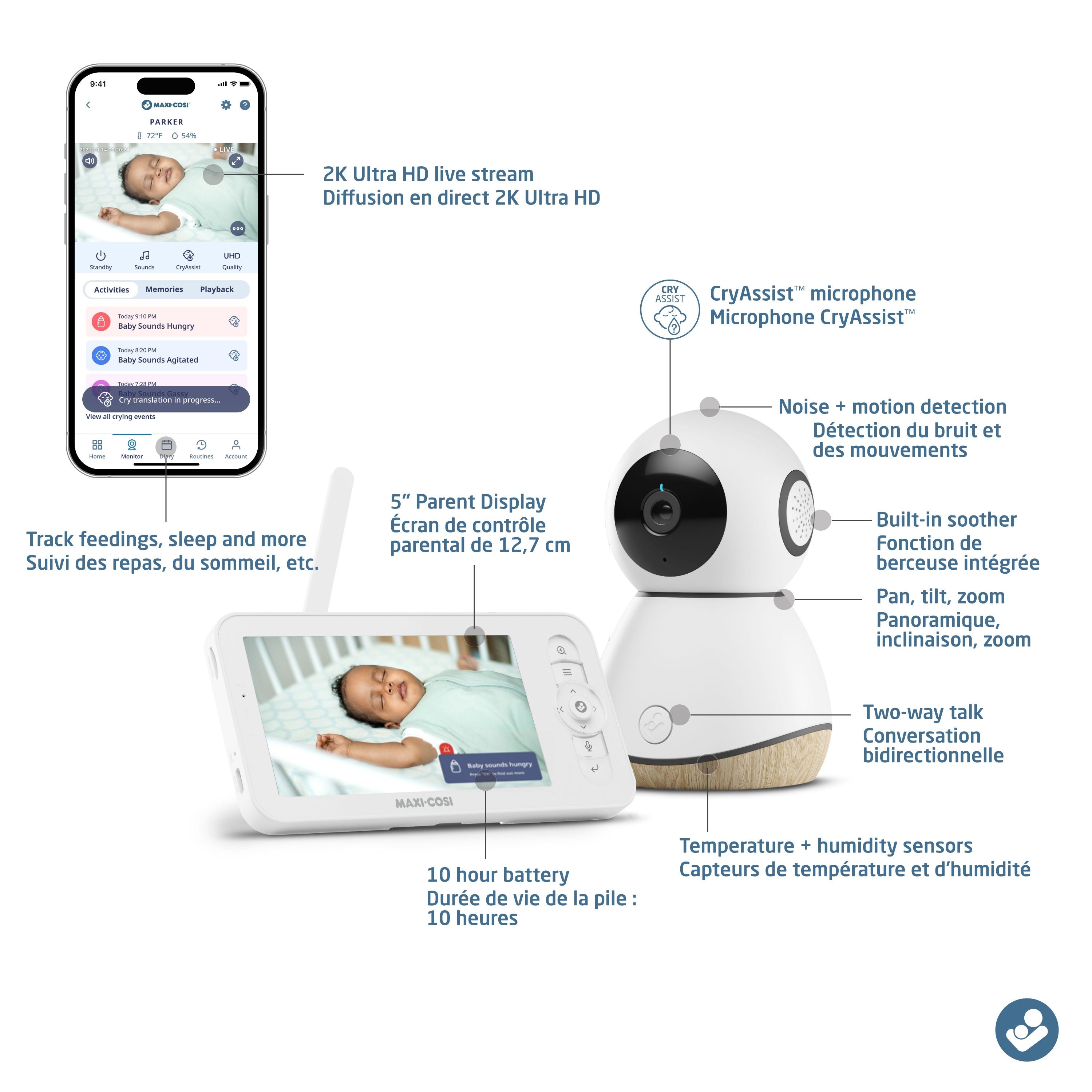 Stay connected to your child effortlessly, even when you’re apart, with the Maxi-Cosi See Pro 360° Baby Monitor. Our revolutionary See Pro 360° features CryAssist™* technology, powered by Zoundream, which translates your little one’s cries using AI. Now you’ll know instantly if they’re sleepy, fussy, gassy, restless or hungry. Other baby monitors detect a child’s cries, but knowing exactly how your baby is feeling means you’ll be able to respond to their needs faster. Your little one is communicating with you, and with CryAssist™, you’ll now know what they’re saying.