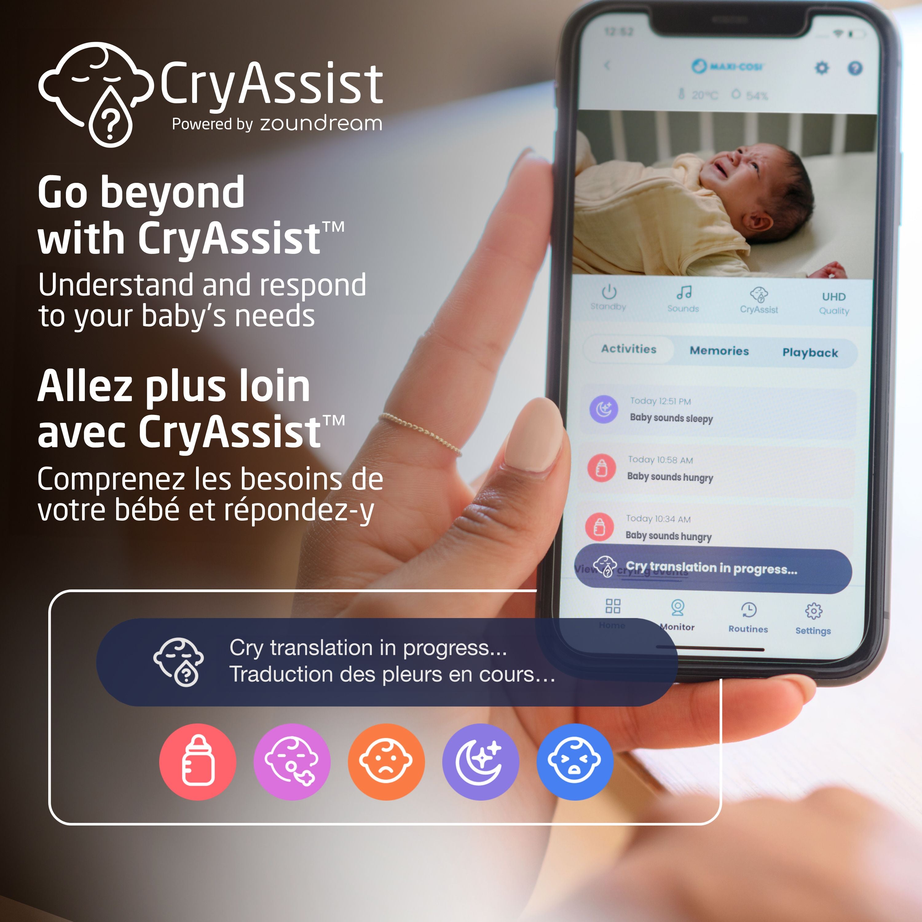 A newborn’s cries convey a range of information, from urgent needs to emotional state. Understanding their language during those important first six months can be challenging for parents, and it takes time. What if you could overcome the language barrier? Meet Maxi Cosi’s See Pro 360, an innovative baby monitor with CryAssist™* technology, powered by Zoundream, that translates your little one’s cries using AI.