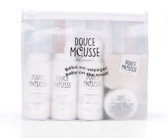 Ideal for the diaper bag or for visits to grandparents, the Douce Mousse "baby on the move" kit includes: 1 body and face cleansing gel 60 ml + 1 shampoo 60 ml + 1 moisturizing body lotion + 1 cream 15g diaper + 100% organic cotton wipe, all in a small airtight pouch with a zipper.