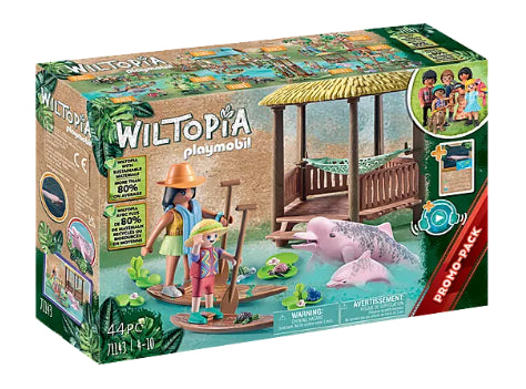 One of Sofia Palmer's main missions during her research work is to study the flora and fauna of the Amazon. Aboard her paddle, she sets off to meet pink dolphins. Although they are a priori harmless, Sofia and her daughter prefer to keep their distance from these rare mammals, for fear of disrupting their lifestyle. At a reasonable distance, both prefer to observe the mother pink dolphin and her little one enjoying a special moment. To be able to observe them at even greater length, why not go to the converted pagoda? A hammock is placed there. Learning while having fun The Wiltopia universe allows children and adults to learn more about the animals that inhabit the world in a fun and interactive way. The additional content available thanks to the special card supplied with the box gives access to numerous online games and quizzes. Wiltopia, a universe that does good for the planet The Wiltopia range is the result of a virtuous creation process. The products in the range are made from 80% recycled or biosourced materials. Through this choice, we wish to highlight our commitment to a more sustainable mode of production and consumption.