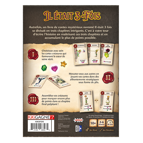Il était une fois, un livre magique de contes de fées qui comportait trois chapitres. Jouez à travers trois chapitres en compagnie de personnages de contes de fées, d'histoires et de légendes. Tout d'abord, sélectionnez votre main de cartes. Ensuite, jouez vos cartes contre vos adversaires et utilisez les capacités de vos personnages pour marquer des points. Enfin, rassemblez vos cartes de départ pour les faire interagir entre elles et remporter encore plus de points, et pourquoi pas la partie ! Si vous choisissez judicieusement les créatures des contes de fées dès le début, vous pourrez remporter de nombreux plis et accumuler beaucoup de points. Des combinaisons astucieuses de cartes peuvent également rapporter des points sans plis, car tout le monde sait, par exemple, que Hansel et Gretel sont particulièrement forts en équipe... Contenu : 50 cartes, 115 marqueurs de points en bois, règle.