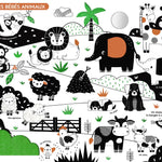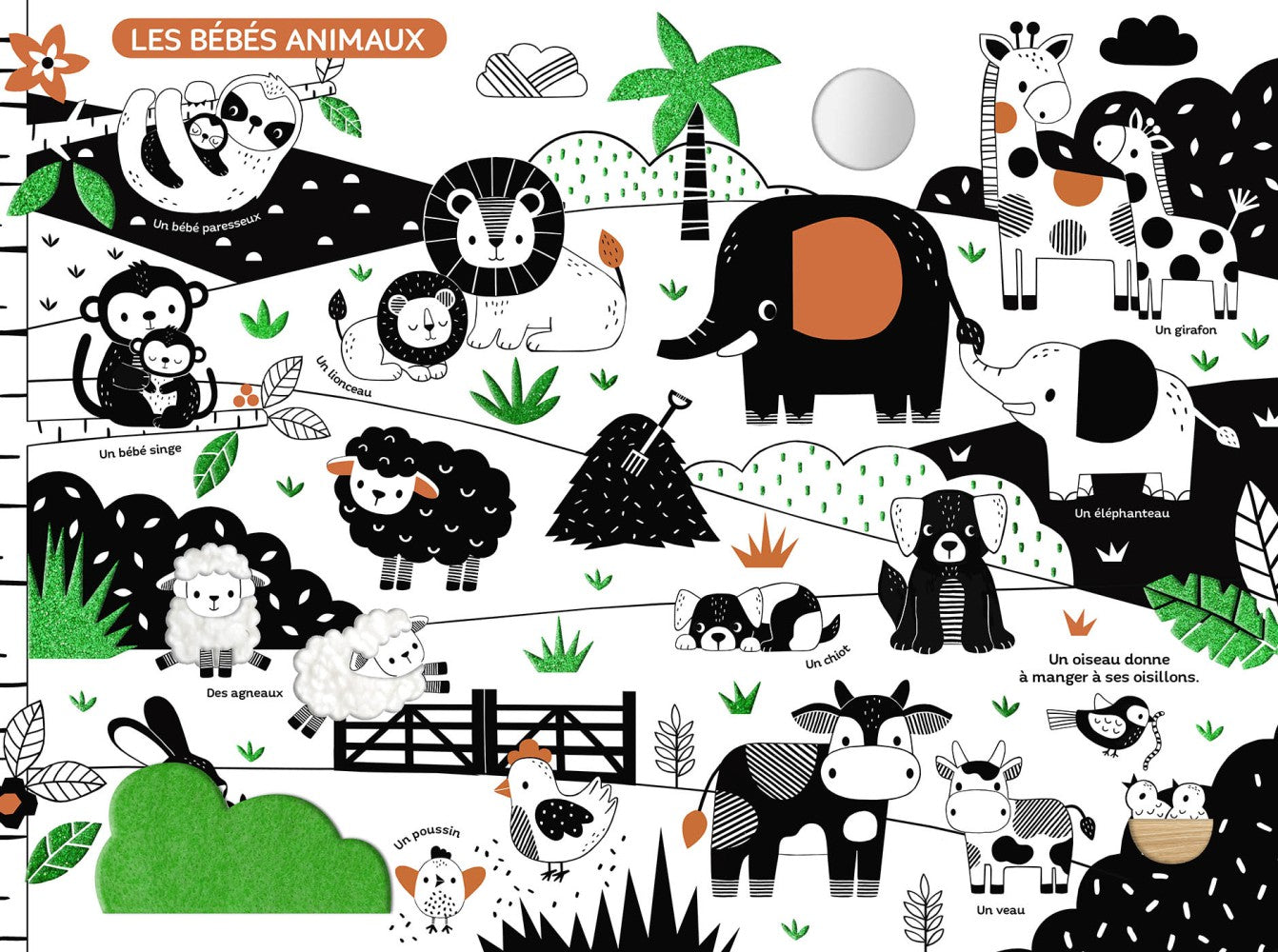 4 grandes planches qui mettent en scène des univers constratés adorés des tout-petits : - La maison et les premiers mots du quotidien- Les bébés animaux- Les animaux géants- Au dodo les animaux !On retrouve plus de 20 matières à toucher et un miroir !