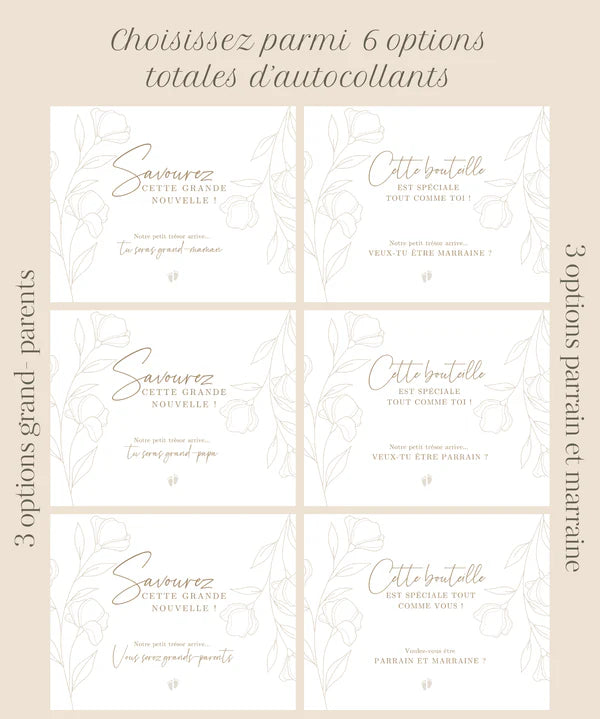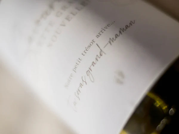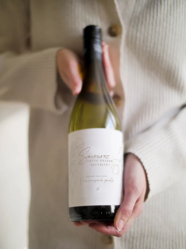 Annoncez votre grande nouvelle à vos proches de façon créative avec nos autocollants pour bouteilles de vin. Achetez une bouteille de vin, remplacez l'étiquette de la bouteille de vin par notre autocollant et remettez la bouteille à vos proches pour leur faire la grande annonce.