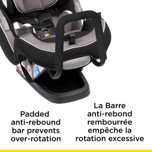 In the rear-facing position, the padded anti-rebound bar is an added safety measure that prevents the car seat from rotating too much in the event of a sudden stop or collision. In the forward-facing position, the Grow and Go ARB protects your child with a harness up to 65 lb (29 kg). The QuickFit™ harness allows you to easily adjust the height of the headrest and harness.
