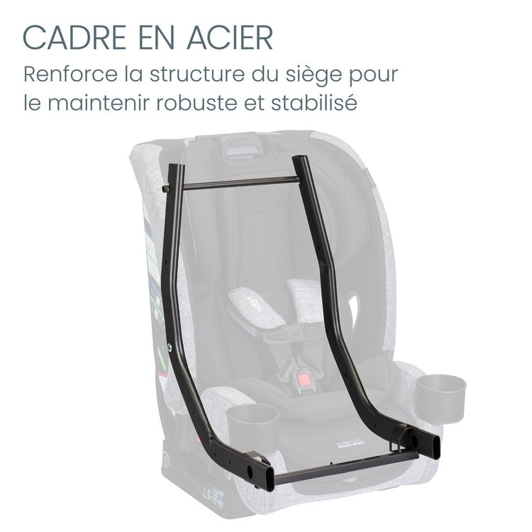Ce siège d’auto mince est doté d’une barre anti-rebond, d’une courroie d'ancrage en V brevetée, de la technologie SafeCellMD, d’un cadre en acier haute résistance et de deux couches de gestion de l’énergie