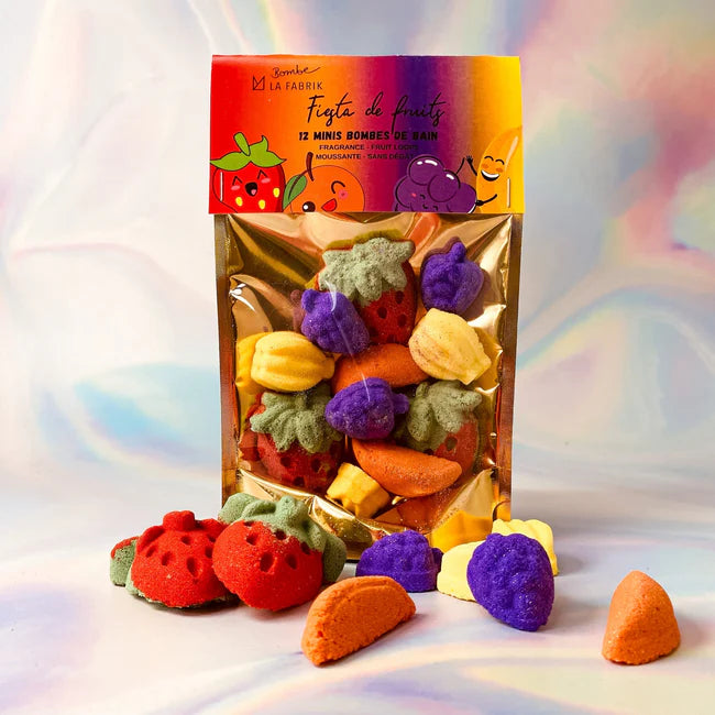 Contains 12 mini bath bombs in various colors and fruits, for a colorful bath!