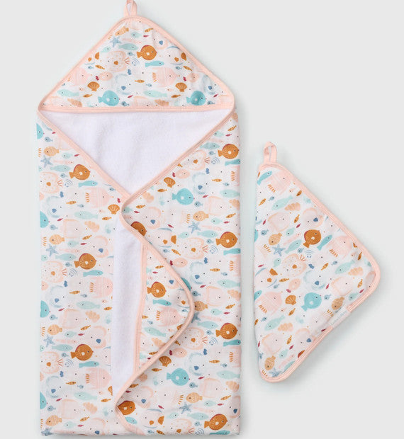 La serviette généreuse garde la tête et les mains au chaud grâce à sa capuche et ses poches, tandis que le gant de toilette assorti est doux pour la peau délicate de bébé.