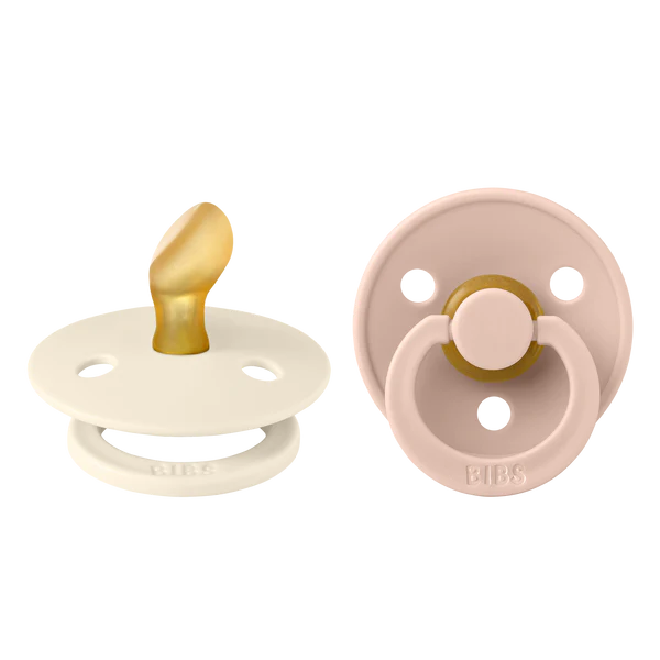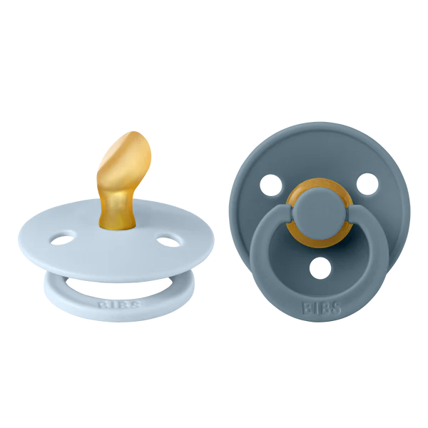 BIBS Color is the original BIBS pacifier and has been on the market for over 40 years. It has the signature round BIBS shield with three air holes and round BIBS engraved handle ring. The anatomically shaped nipple is curved at the top for a natural fit to baby's palate with an angled tip for easy tongue placement.