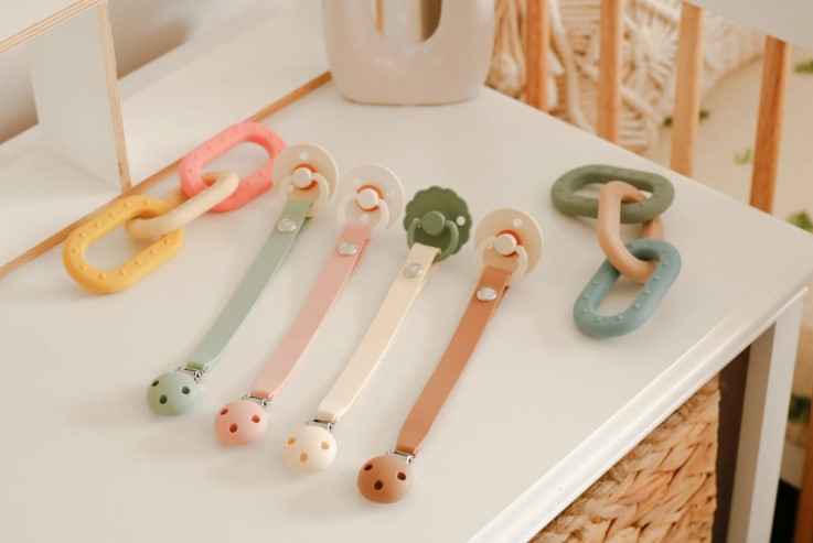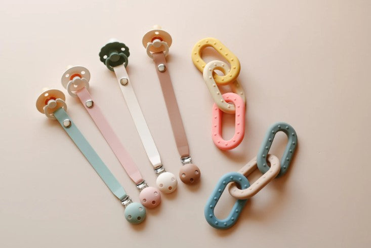 The 100% silicone pacifier clip to chew is an essential accessory for baby! It keeps the pacifier always within reach of the hand and mouth and prevents it from constantly falling on the floor! The pacifier clip is ideal for relieving the pain associated with teething. It is both a fashionable, practical and fun accessory for baby!