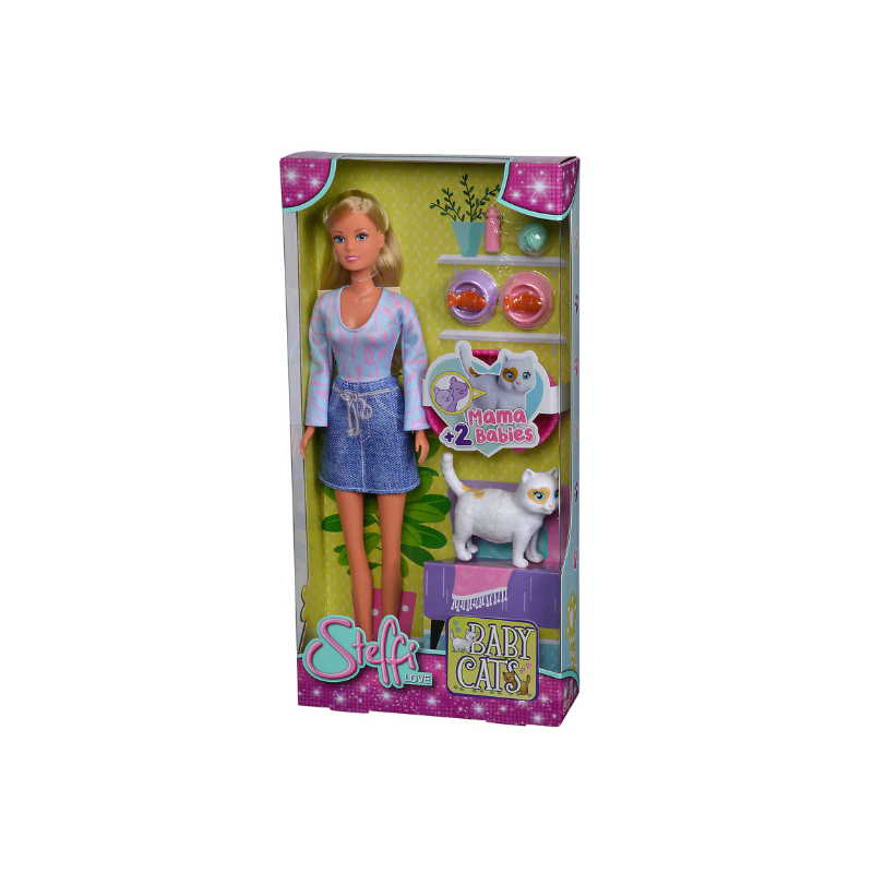 Un ensemble parfait pour les jeunes amoureux des animaux. Steffi est habillée d'une tenue à la mode et est accompagnée d'une maman chat enceinte et de deux adorables bébés chats. Comprend des accessoires pour s'occuper des chats, comme un biberon et un panier. Cet ensemble est sûr de fournir des heures de jeu imaginatif et d'apprendre aux enfants à prendre soin des animaux.